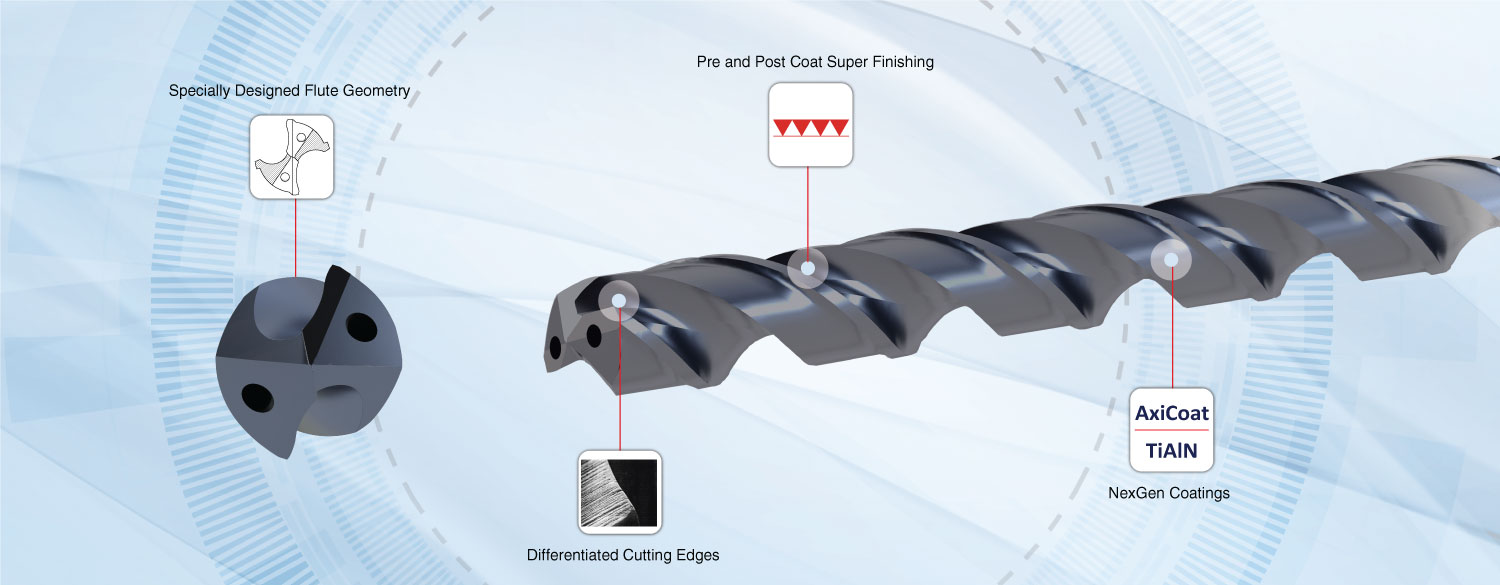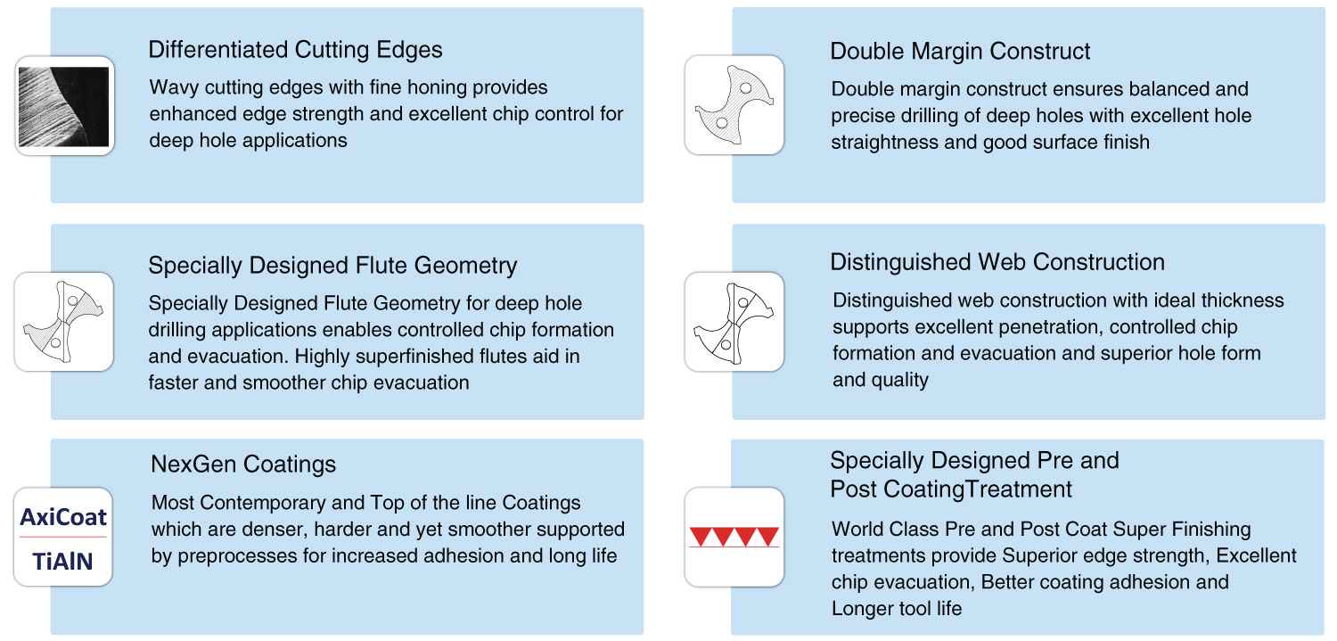 INDrill Cool : The four-margin construct with differentiated web taper and specially designed flute and wavy cutting edges along with MMP superfinished flutes is a High-Performance drill meant for super long drilling across a wide variety of materials and applications.